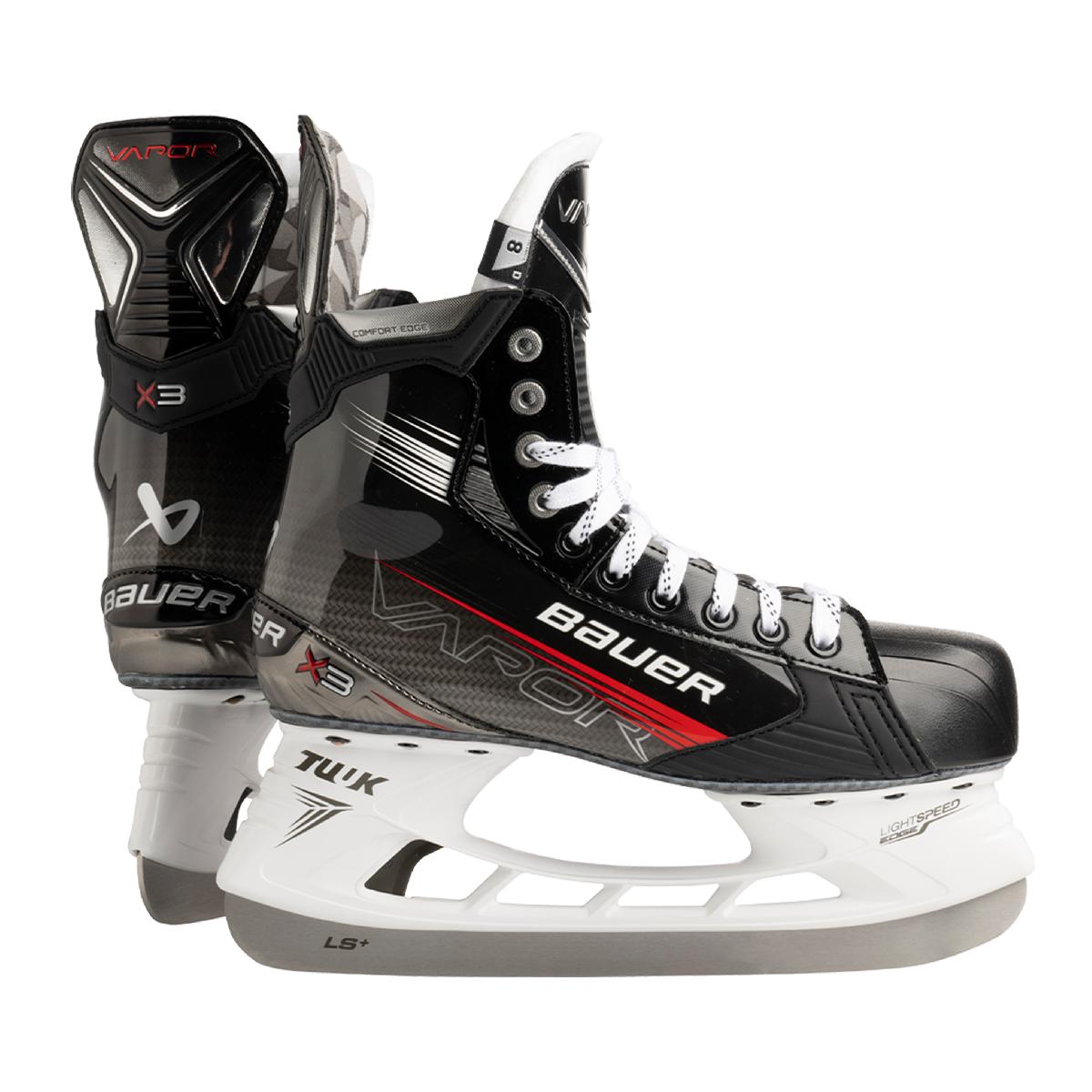 Завершает коллекцию VAPOR модель VAPOR X3. Созданные специально для амбициозных хоккеистов VAPOR X3 оснащены отличным ботинком DIGI COMP, гарантирующим малый вес и комфортную посадку, традиционным войлочным языком PRO STOCK плотностью 40 унций, обеспечивающим первоклассную поддержку и гибкость, а также стаканом LS EDGE, благодаря которому коньки показывают стабильные результаты на льду.